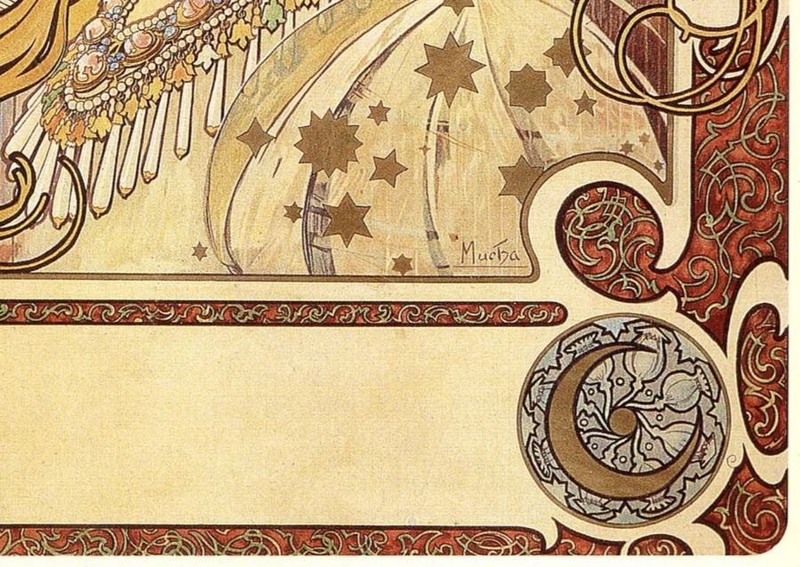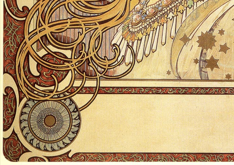 Обрамление — оболочка, которая содержит внутри настоящее чудо — всевозможные, сложные и безумно детализированные орнаменты, которые можно рассматривать вечность. Помимо дополнения композиции и собственной символики, каждый орнамент в картинах Альфонса мухи может иметь разные назначения.