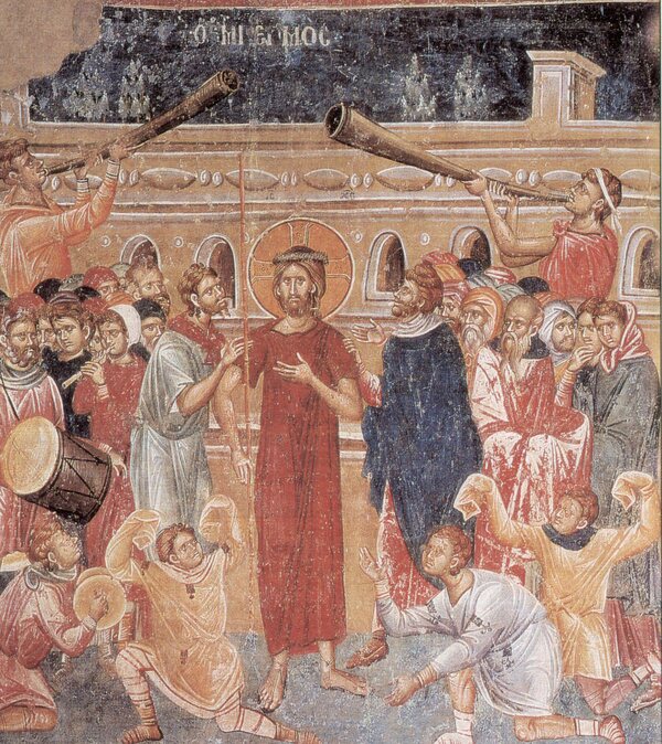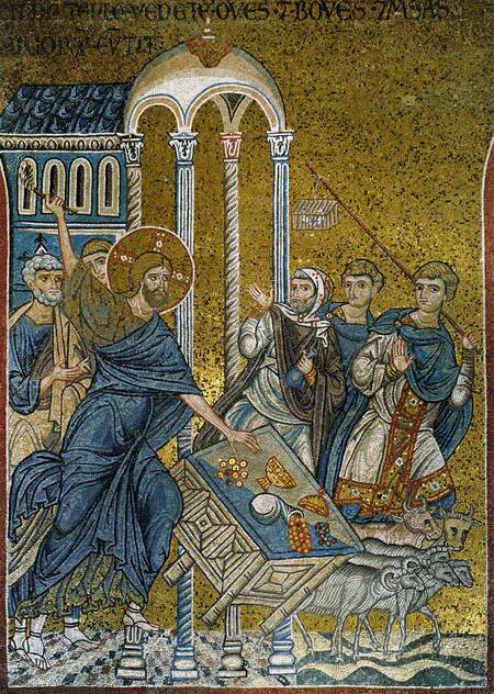 «Иисус Христос, сделав из веревок бич, выгнал из храма всех торговцев с их животными. Столы меновщиков опрокинул и деньги их рассыпал. И сказал продающим голубей: „Возьмите это отсюда, и дом Отца Моего не делайте домом торговли“. Никто не посмел ослушаться Иисуса»