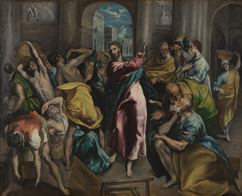 Сюжет «изгнания торговцев из храма», многократно воспроизводившийся Эль Греко и его мастерской, является одним из немногих фрагментов Евангелия, который может трактоваться в ключе раскрывающих «человеческую» природу Христа. Всегда спокойный и милосердный, в данной сцене Иисус проявляет несвойственную ему жесткость, разгневанный беспорядком, наведенным торговцами в «Доме божьем»: