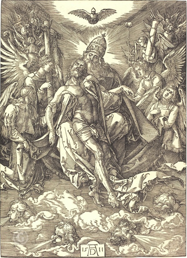 Изображая «Святую троицу», Эль Греко, вероятно, как и другие маньеристы его поколения, вдохновляется одноименной гравюрой Альбрехта Дюрера, — произведения построены по одному принципу: в центре композиций — тело мертвого Христа, лежащее на руках у скорбящего Отца, над ними — белая голубка, воплощающая Святой дух, вокруг — ангелы, утопающие в плотных облаках. Однако на картине Эль Греко Троица безусловно предстает более осязаемой, очеловеченной, и дело не только в возможностях живописи, не доступных технике гравюры. Оба мастера уделяют внимание телесности Христа, прописывая складки его кожи, раны, мышцы и выступающие кости, однако у Эль Греко Троица перестает быть источником света. Лучи света, на гравюре Дюрера исходящие от Отца и Святого Духа, на картине Эль Греко берут начало за пределами полотна. Троица, изначально написанная предельно «материальной», переставая быть «светоносной», «низводится до человеческой уязвимости» [6].