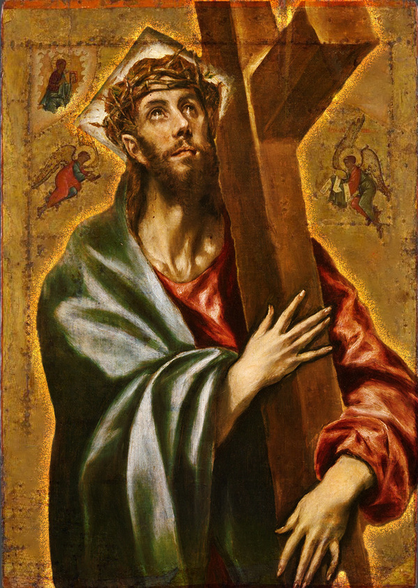 При рассмотрении обращенных к небу глаз Эль-Грековского Иисуса, кажется, словно в них тоже застыли слезы. И в то же время отражающий небесный свет взгляд проникнут безмятежностью и глубоким сознанием «правильности» грядущего. Ни лицо, ни тело Спасителя не искажены болью: он легко, почти не касаясь, держит массивный крест, а на губах даже заметна едва уловимая умиротворенная улыбка.