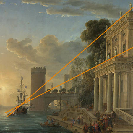 Хотя Клод Лоррен работал в эпоху Барокко, его метод противостоит хаосу. Исследователи (например, Ю. К. Золотов) относят Лоррена к линии классицизма: свет у него служит инструментом разума, выстраивая гармоничную композицию [1]. Это «тихая революция» внутри шумной эпохи. До Лоррена солнце оставалось сакральным или опасным объектом, который художники прятали за руинами или деревьями [2].