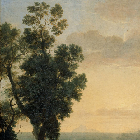 В этом зрелом шедевре свет не выстраивает чёткую геометрию (как в портах), а буквально насыщает воздух, становясь плотной световой средой. Обратите внимание, как Лоррен трактует листву: он отказывается от жёсткой графичности в пользу мягких тональных пятен, позволяя свету «размывать» границы форм.