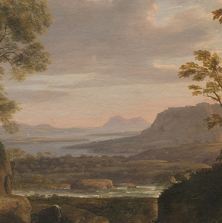 Клод Желле (1600–1682), известный как Клод Лоррен, — центральная фигура римского пейзажа XVII века. Работая в Риме, он прошёл путь от влияния северной школы и итальянских коллег к сформированной, узнаваемой «классической» манере: архитектура, фигуры и природа в его работах подчинены ясной световой логике. Свет в произведениях Лоррена функционирует как архитектор пространства. Художник использует световую диффузию и атмосферную перспективу для слияния строгой классической композиции с поэтической чувствительностью. Его пейзажи строятся на контрасте между тёмными массивами переднего плана и светлеющей дымкой дали, где свет ближайшего горизонта становится источником гармонии и ритма. Таким образом, свет не просто элемент изображения, а принцип, определяющий смысл и единство композиции.