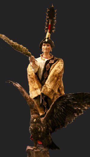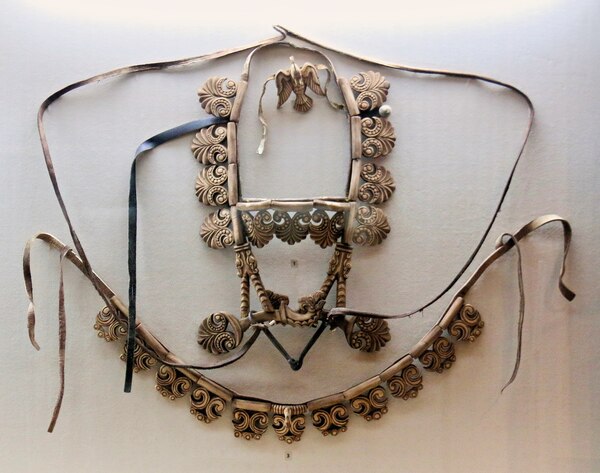Слева — реконструкция образа «Белой Госпожи», справа — сбруя одной из шести лошадей, обнаруженных в погребении.