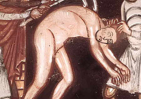 На этой сцене показано мученичество: святые через свои страдания демонстрируют образец истинной святости. Кровь на картине делает сцену особенно пронзительной — зритель буквально видит, какой ценой даётся эта духовная жертва, ощущает всю тяжесть физических мук.