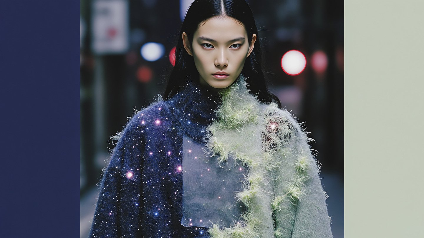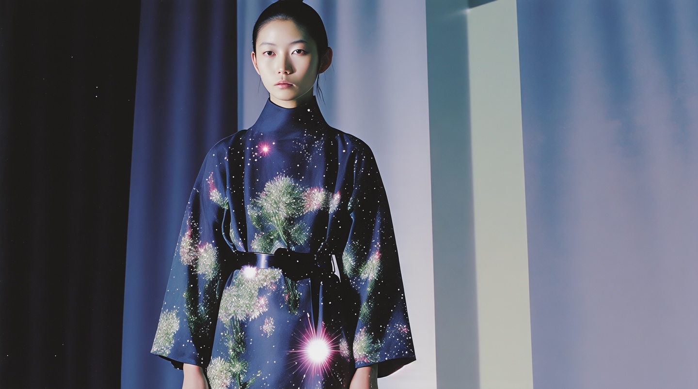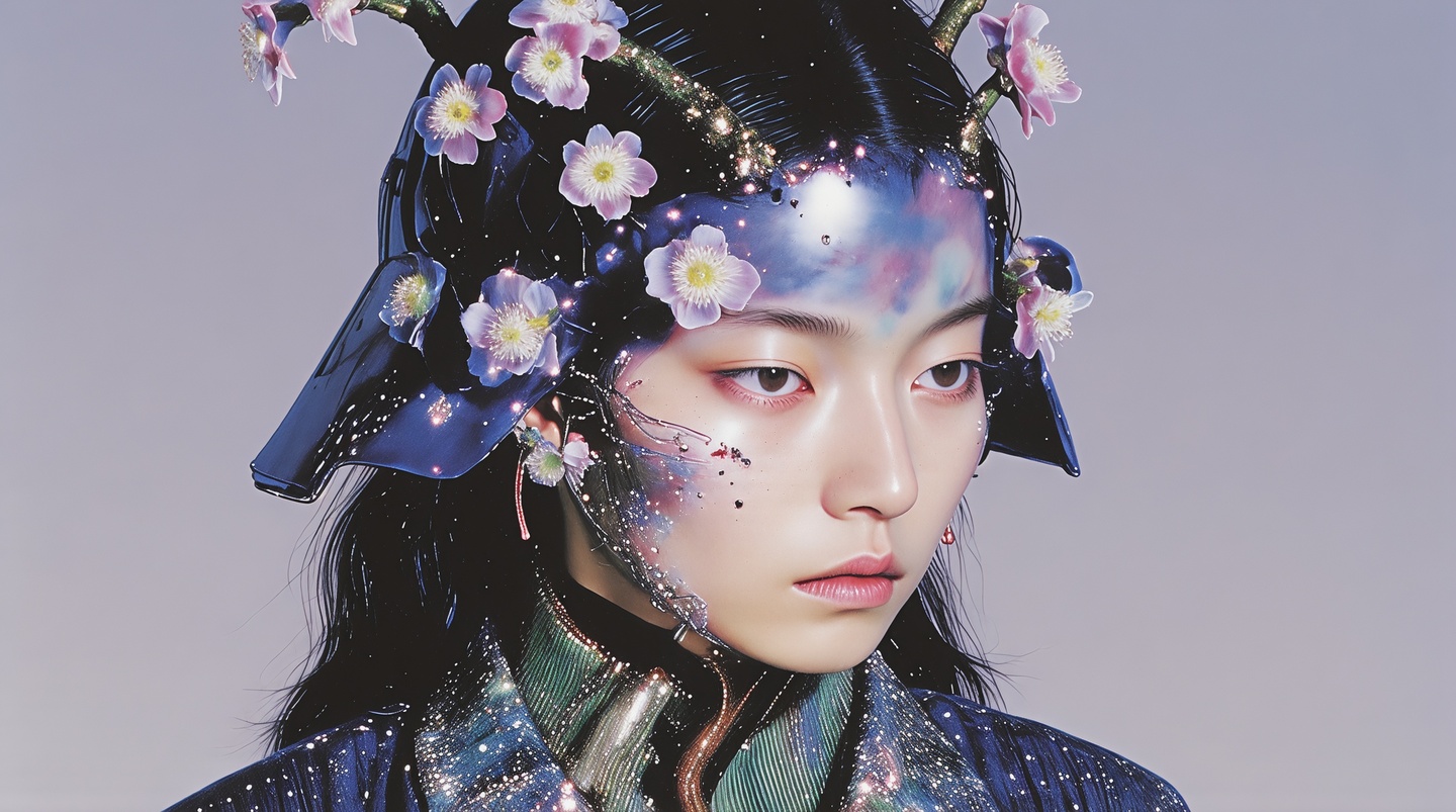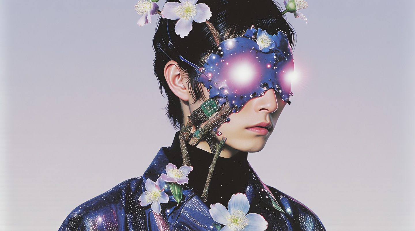 Промт: conceptual fashion art, a model is half-human, half-digital entity. Their clothing is a living ecosystem of circuit boards that bloom with electric flowers, glitch art aesthetics, texture of bark and binary code, ethereal glow, muted colors with pops of cyan and magenta. colors from photo.