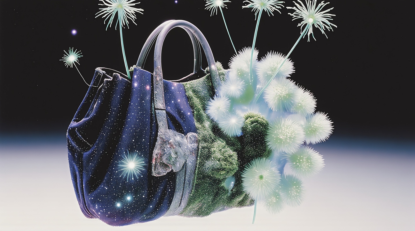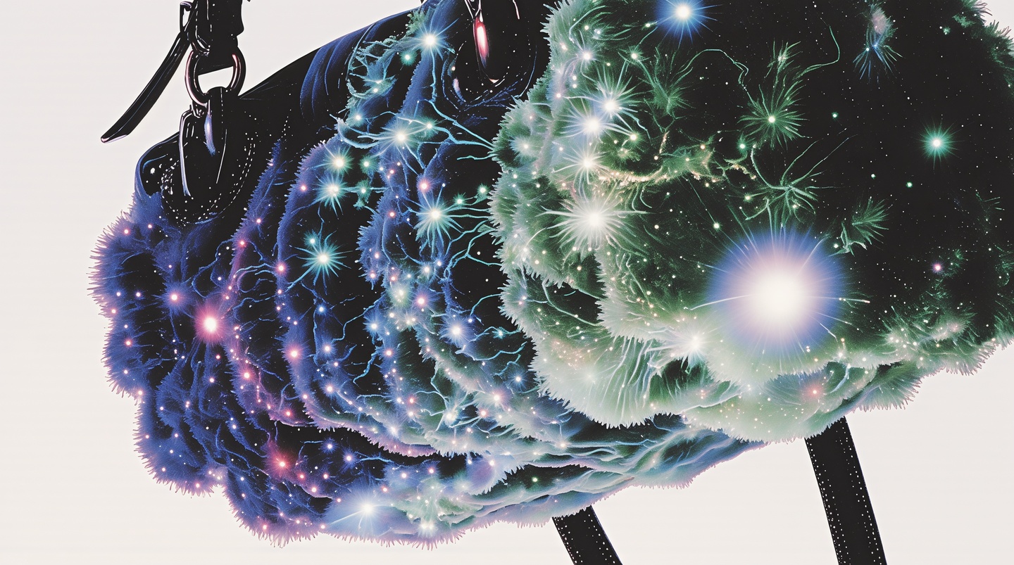 Промт: a futuristic tech-bio handbag, glowing data streams and electric cyan circuits are woven into soft, moss-like green fabric. The bag has an asymmetric, organic shape, like a living organism. Holographic projections of aquatic plants float above its surface. Rendered in a palette of mint green, seafoam, and electric cyan. Hyper-detailed, 3D render, high fashion accessory, minimalistic background. colors from photo.