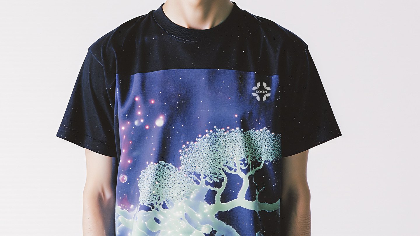 Промт: black t-shirt with SOON brand logo, futuristic streetwear, the design is a fusion of a digital circuit board pattern and a living mycelium network, all in glowing cyan and mint green colors, the print has a subtle texture and a slight glow, the t-shirt fabric is high-quality cotton, modeled on a minimalist mannequin, dramatic studio lighting.