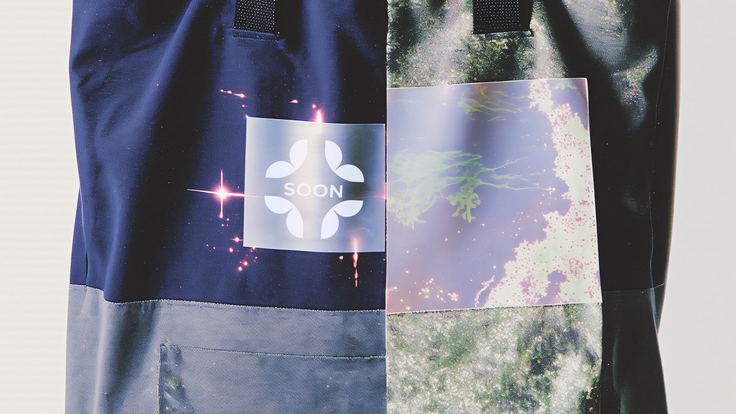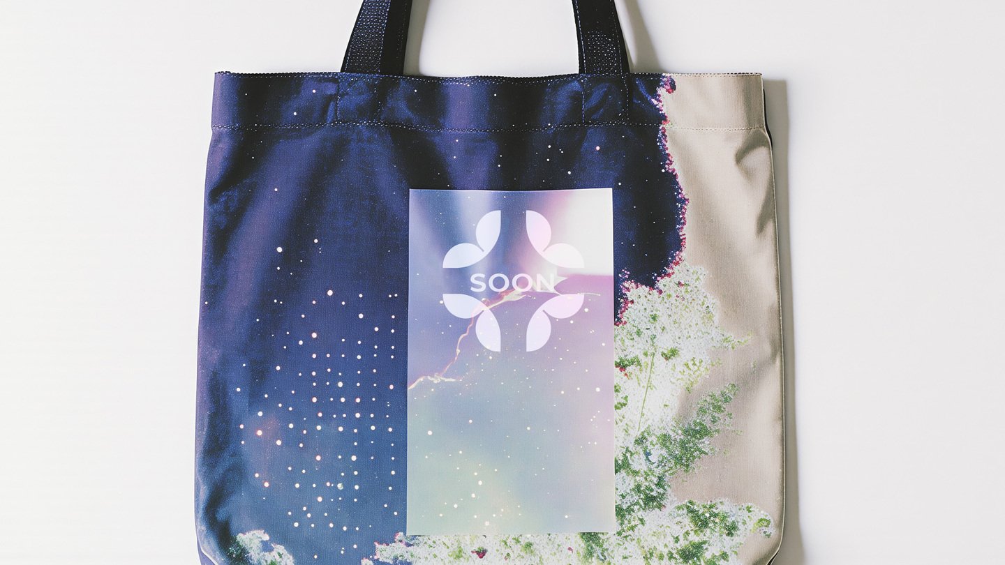 Промт: eco tote bag for SOON clothing brand, tech-wear aesthetic, sturdy beige canvas fabric, the SOON logo is not just printed but appears as a glitch-art holographic projection over the fabric, some binary code and organic moss-like textures subtly blended into the background, deep pocket, stylish product photography, soft natural lighting.