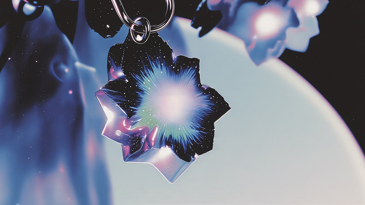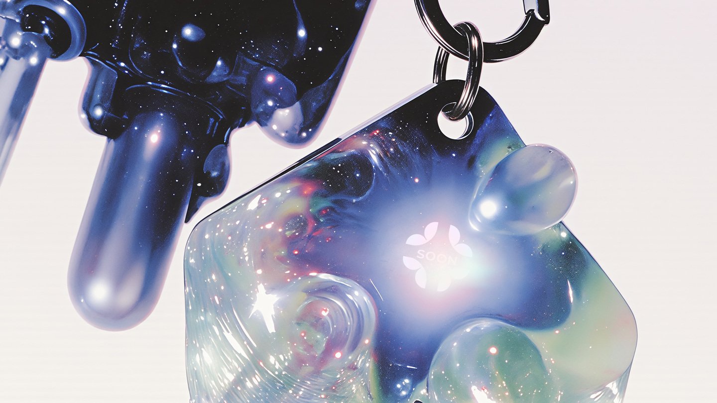 Промт: keychain for brand, sculptural tech-bio accessory, made of polished bioplastic in an abstract organic shape that resembles a data crystal, with the SOON logo embedded as a tiny hologram, attached to a metal carabiner, glowing from within with a soft cyan light, hyper-detailed macro product shot, clean background.