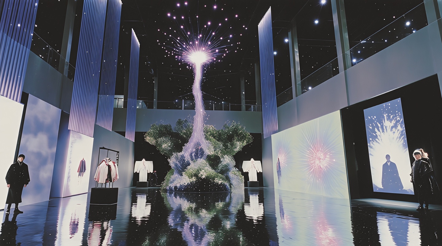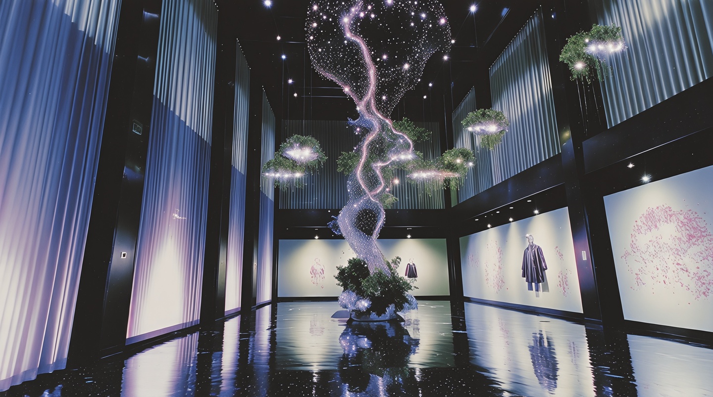 Промт: interior of futuristic concept store, spacious minimalist atrium, central sculpture made of light and data-streams, clothing displays on floating organic-shaped platforms, walls are living walls with bioluminescent plants and integrated digital screens showing glitch art, lighting is soft and ambient with neon cyan accents, polished epoxy resin floor that reflects the holograms, architectural visualization, 3D render.