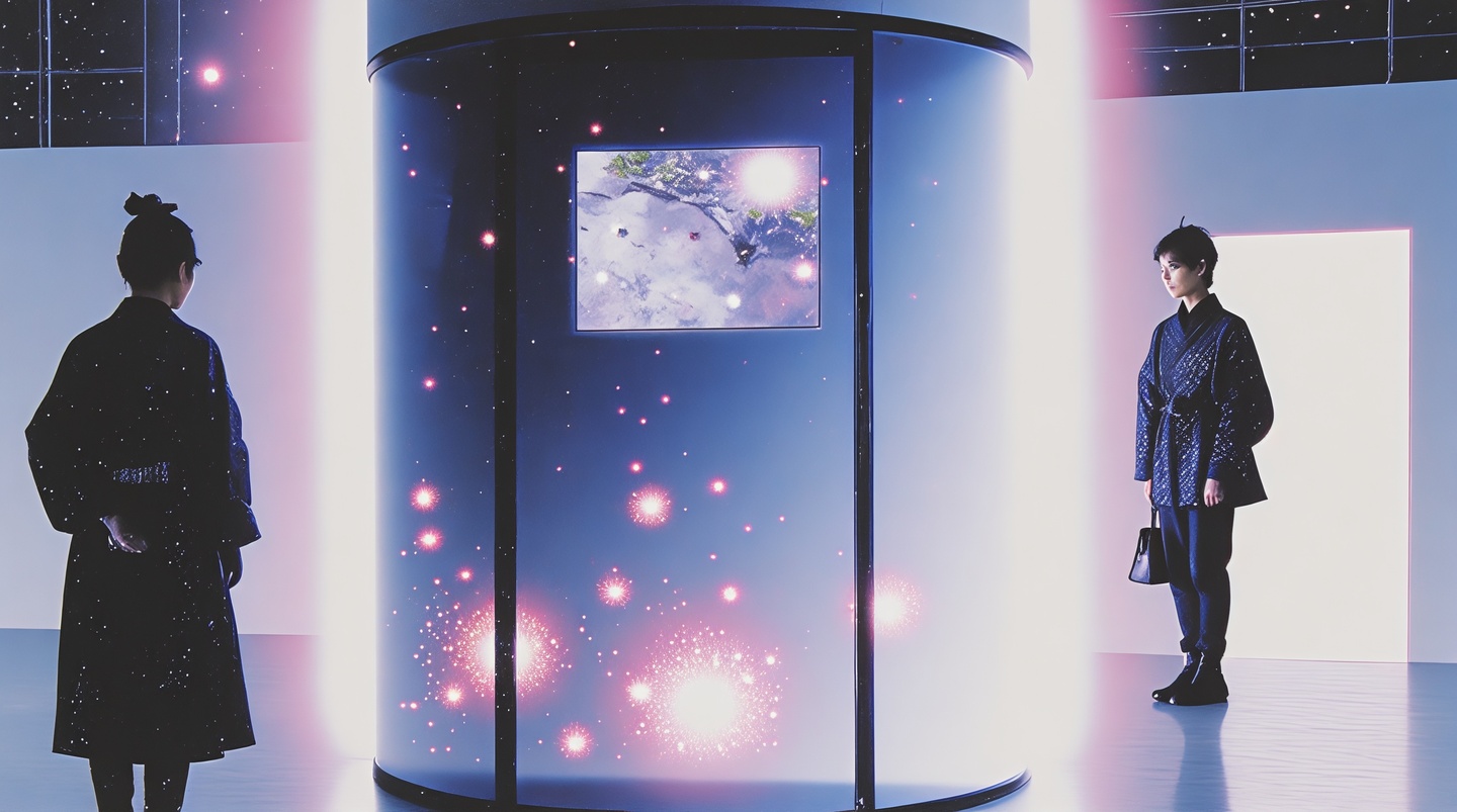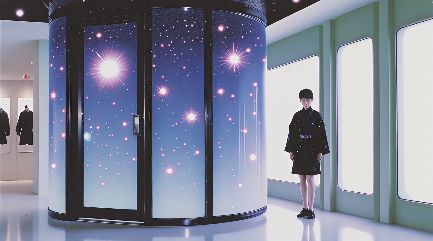 Промт: futuristic fitting room in store, cylindrical pod made of smart glass, when activated the glass displays flowing data-visualizations and organic patterns in seafoam green and electric blue, soft diffused lighting, privacy is maintained by a shimmering energy field instead of a door, clean and luxurious design, hyper-realistic 3D render.