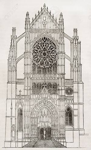 Французские соборы: логика, целостность и компактность. Анализ планов ведущих французских соборов выявляет общую тенденцию к структурной ясности и центрированности. В плане, как правило, присутствует форма простого прямоугольного креста. Трансепты либо слабо выступают за линию основных стен, либо их выступ минимален. Акцент сделан на единстве нефа, трансепта и хора, который завершается апсидой с венцом капелл. Эта компактность создает ощущение собранного, цельного пространства, где все элементы подчинены единому вектору движения к алтарю, визуально направляя взгляд и движение верующих строго на восток.