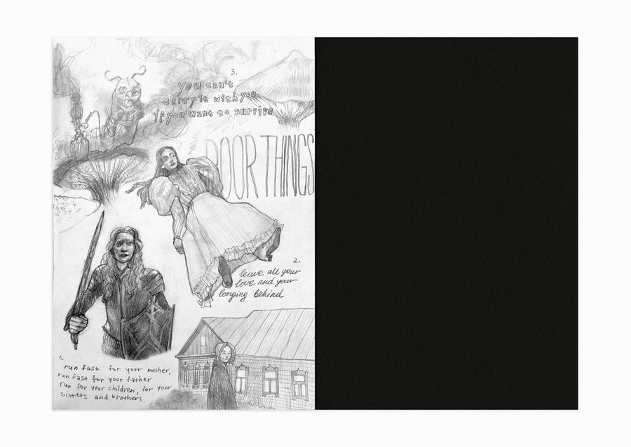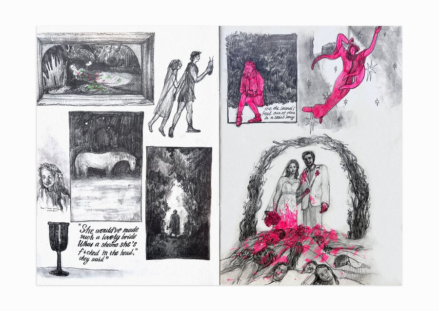 Серия однокадровых комиксов, посвященная мрачной сказке о деревенской свадьбе, о невесте, сбежавшей в туман, о ведьминском круге, зельях и заклятьях. Героиня бежит, оставляя позади пустоту ’уснувшей’ деревни, прерывает круг обыденности.