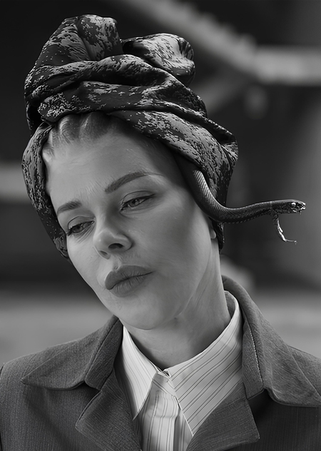 В древнегреческой мифологии Медуза Горгона была представлена в виде чудовища с женским лицом, ее горящий взгляд превращал человека в статую, а вместо волос на голове были змеи. На теле была чешуя, а сама она была с клыками и с острыми когтями.