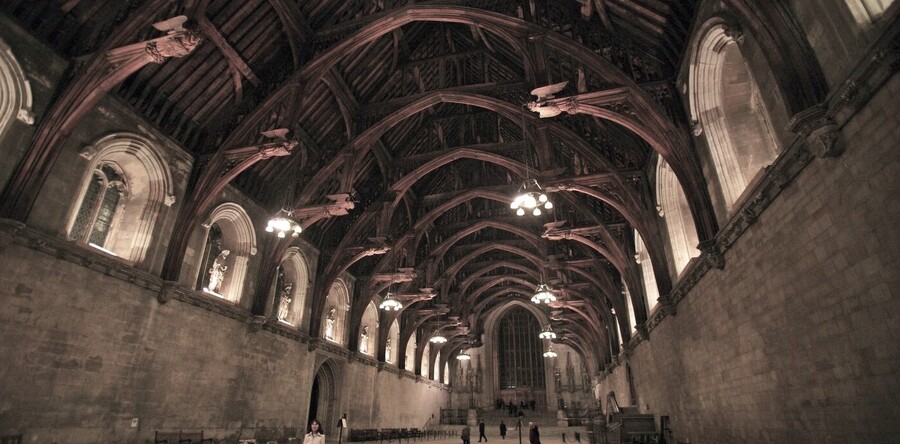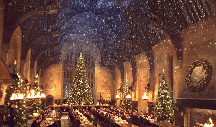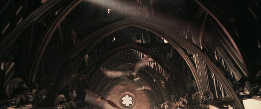 Одной из самых запоминающихся деталей является зачарованный потолок, который в фильмах имитирует внешний небосвод и меняется в зависимости от времени суток и погодных условий. Арочная конструкция отсылает к потолку Вестминстер-Холла XIII века — одному из выдающихся примеров поздней готики.