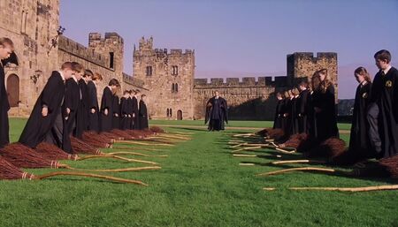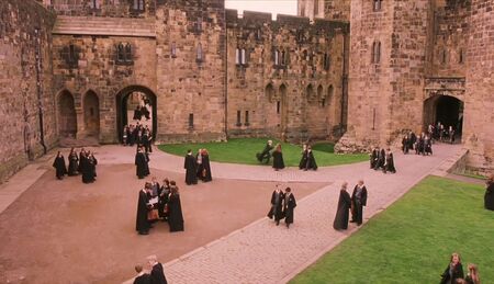 Другим местом съемок стал Замок Алник — средневековая крепость, где у героев был первый урок полета на метлах. Замок массивный с мощными каменными стенами и арочными проемами. Однако создатели решили не брать замок за основное вдохновение, так как он недостаточно полно передавал фантастический художественный образ Хогвартса. Вместо этого они сосредоточились на архитектуре средневековой готики.