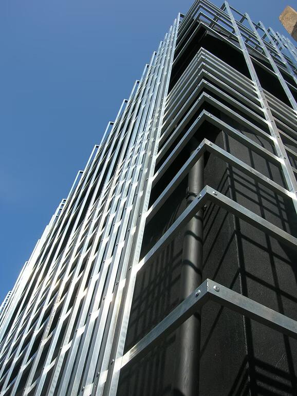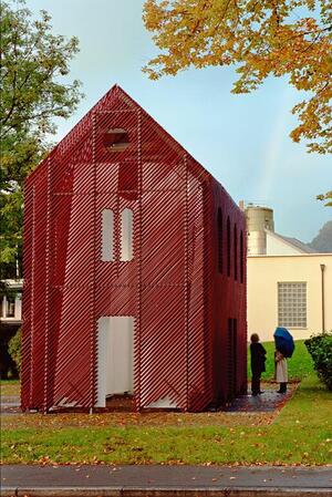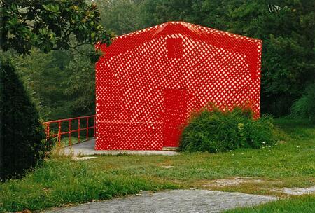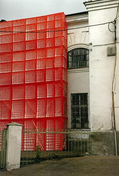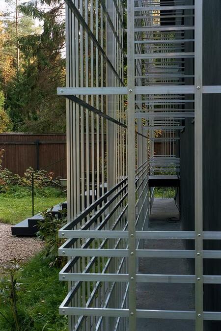 Алюминиевый дом помещен в конце исследования, как одна из «переходных» точек, где привычная структура штрихов Константинова становится максимально приближенной к тому чтобы стать фасадом индивидуального дома. Всё же металлические рейки не становятся ограждающими конструкциями, а скорее деформируют исходную форму существующего здания, вступая в диалог с его структурой, рождая в зрителе игру познавательных способностей.