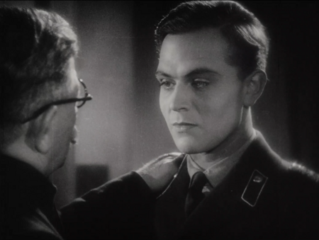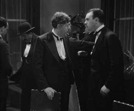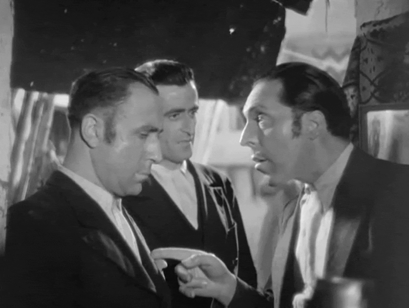Напряжение между коммерсантом Забелем, шантажирующим дезертира, и Жаном оборачивается убийством. Кадры из фильма «Набережная туманов» (реж. Марсель Карне, 1938)