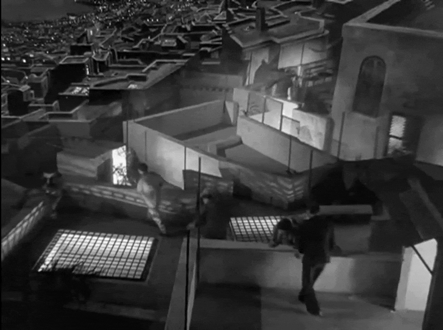 Преступники приспособляют городские пространства, не конвенциональные для обычных граждан. Первый эпизод «Вампиров», по сути своей камерный и снятый большей частью в интерьерах, неожиданно заканчивается элегантным, почти акробатическим побегом черных фигур. Похожим образом крыша используется в «Пепе ле Моко», где кадры побега банды рифмуются с первым пролетом над алжирским кварталом.