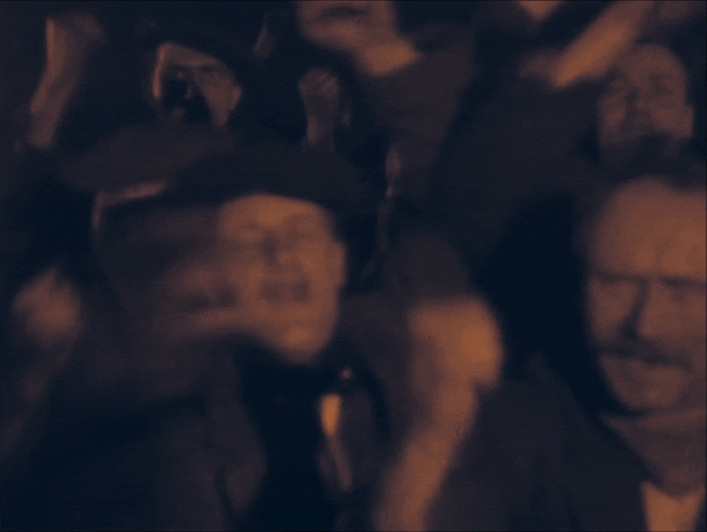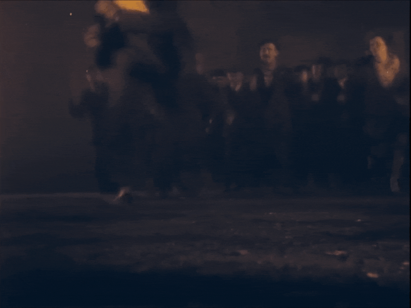 Эта сцена снята так, чтобы быть максимально страшной. Помимо резкости перехода, она включает кадр с ракурса снизу, так что оператора будто затаптывают сотни ног; общие планы с лесом рук, тянущихся к жертве, где картина напоминает давку. Город искал убийцу, но нашел себя.