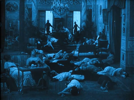 Кто-то выключает свет в главной зале. Гости подозревают, что к ним проник орудующий в городе серийный убийца. «Жилец» (реж. Альфред Хичкок, 1927)