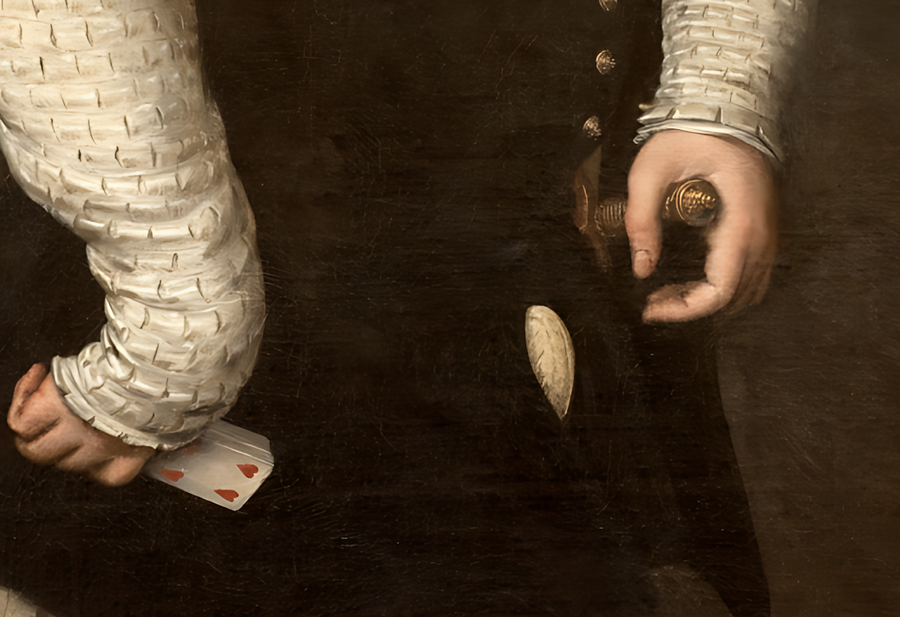 Однако именно детали выдают его истинный статус. Если присмотреться, то можно увидеть, что в руках он держит шутовской жезл — традиционный атрибут придворного дурака. Его костюм сочетает несочетаемые цвета и ткани, что соответствует идее шутовского наряда. Но главная деталь — крошечный герб его хозяина, вытканный на одежде. Это клеймо собственности, которое превращает живого человека в атрибут власти. Художник создаёт образ двойственности: внешне — уважаемый человек, но через детали — собственность графа.