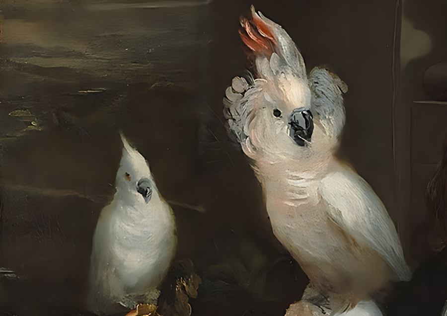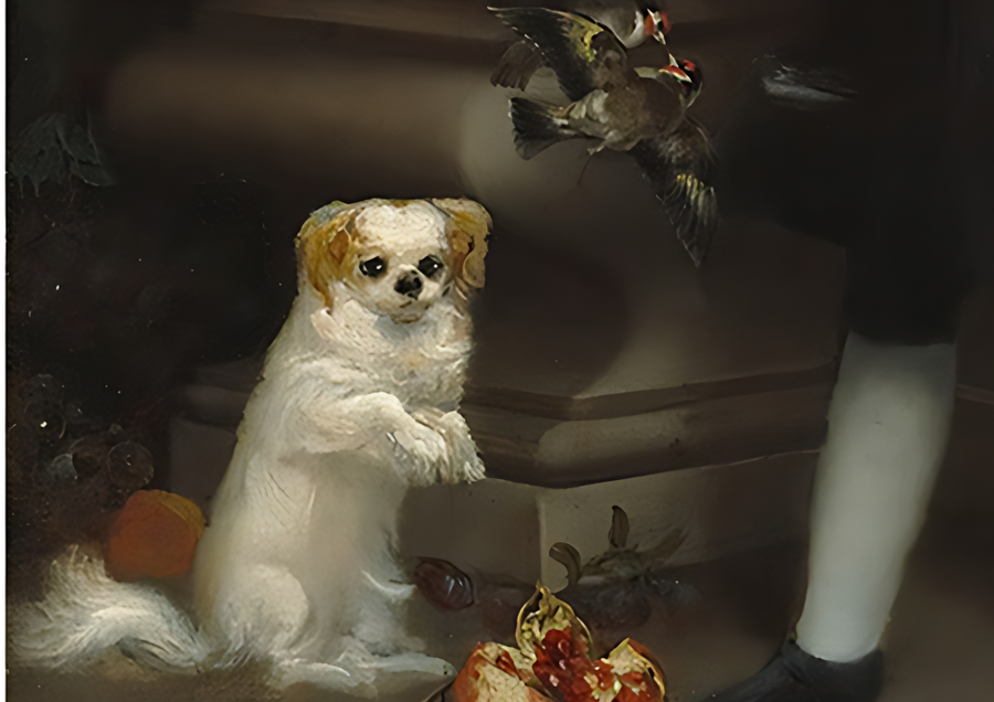 Попугай на руке Мичо — символ экзотической редкости, отражающий его собственный статус «человеческой диковинки». Собаки у ног олицетворяют верность, но также намекают на его положение придворного питомца.