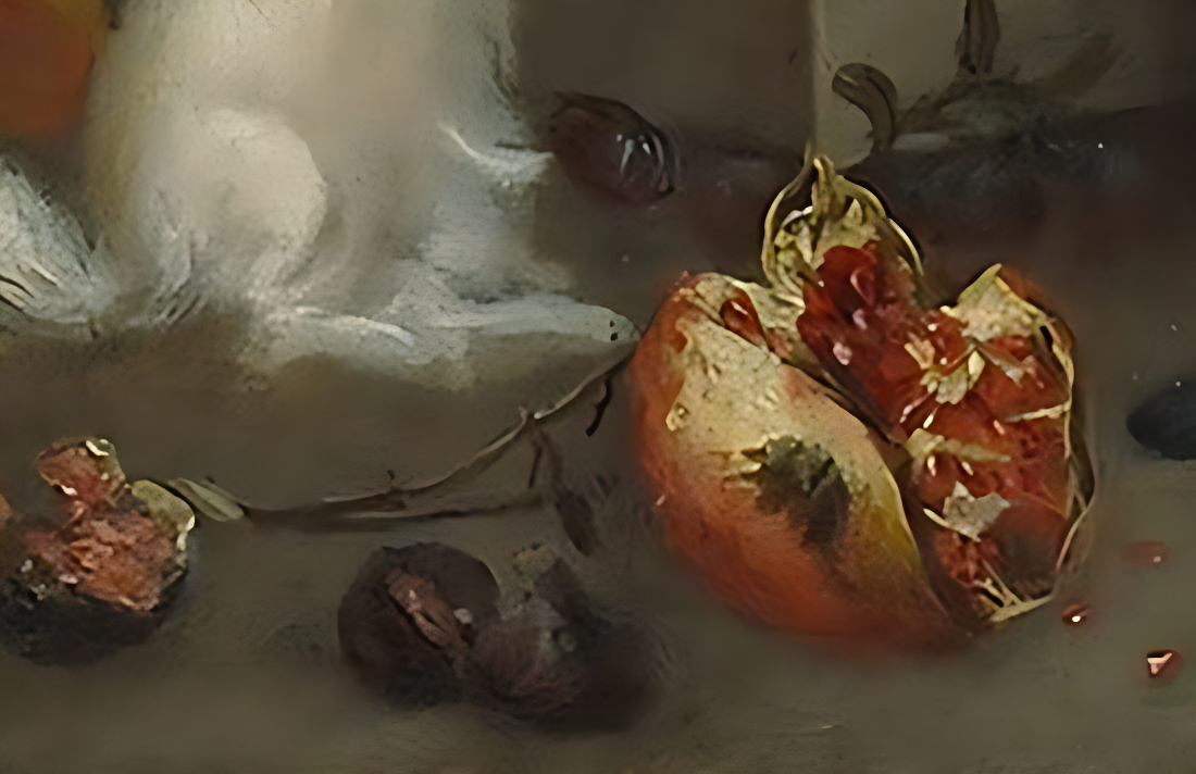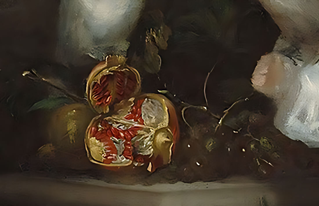 Раскрытые гранаты с обильными зёрнами — аллегория плодородия и изобилия, недоступного самому карлику. Лопающиеся плоды символизируют хрупкость существования. Летающие птицы представляют свободу, противопоставленную ограниченному миру придворного.