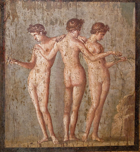 Фреска «Женская фигура у лабрума» Помпеи. I век н. э./Фреска «Три грации» Помпеи. I век н. э.
