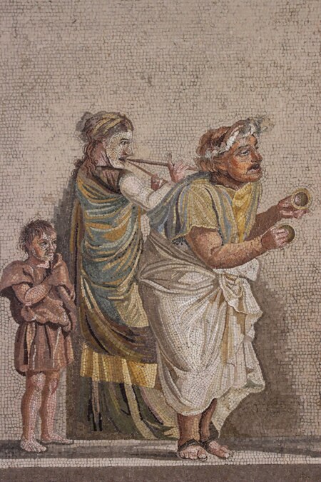 Мозаика «Уличные музыканты». Диоскурида из Самоса, Вилла Цицерона, Помпеи. 2-я половина II века до н. э. / Мозаика «Совет колдуньи», Помпеи. III век до н. э.