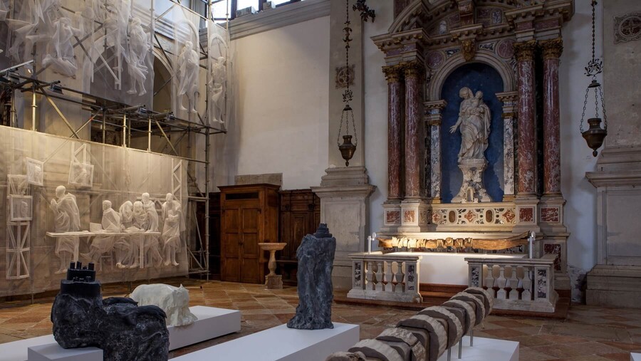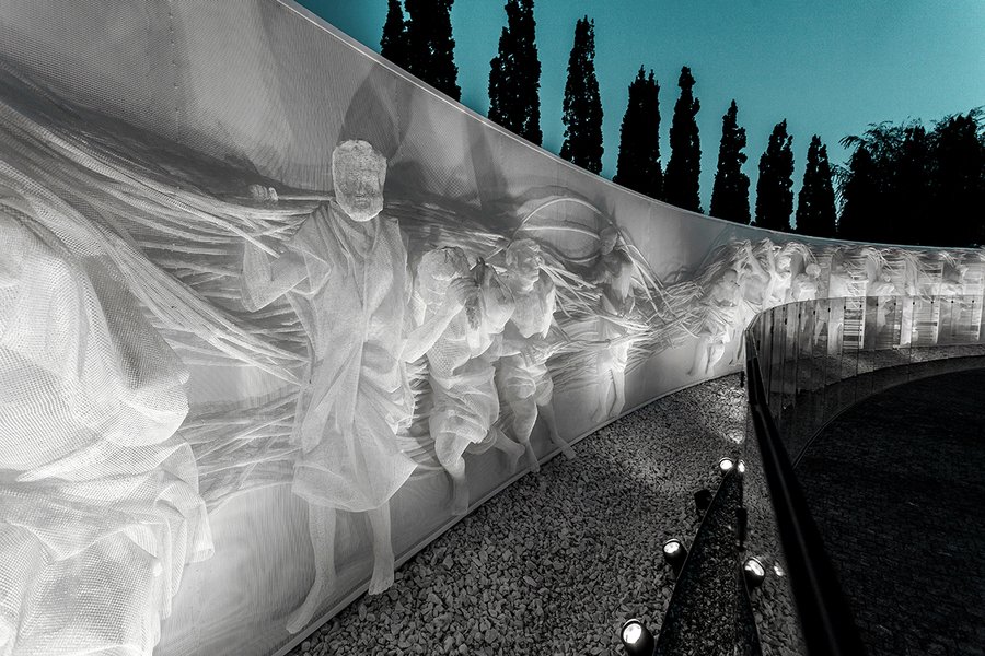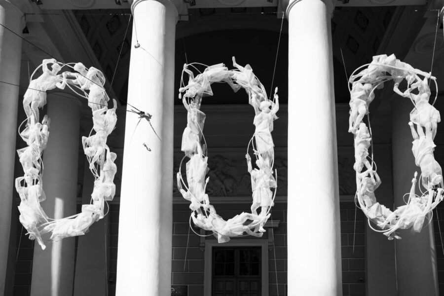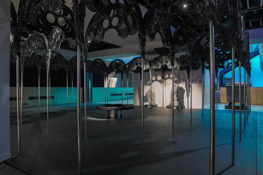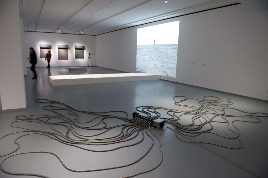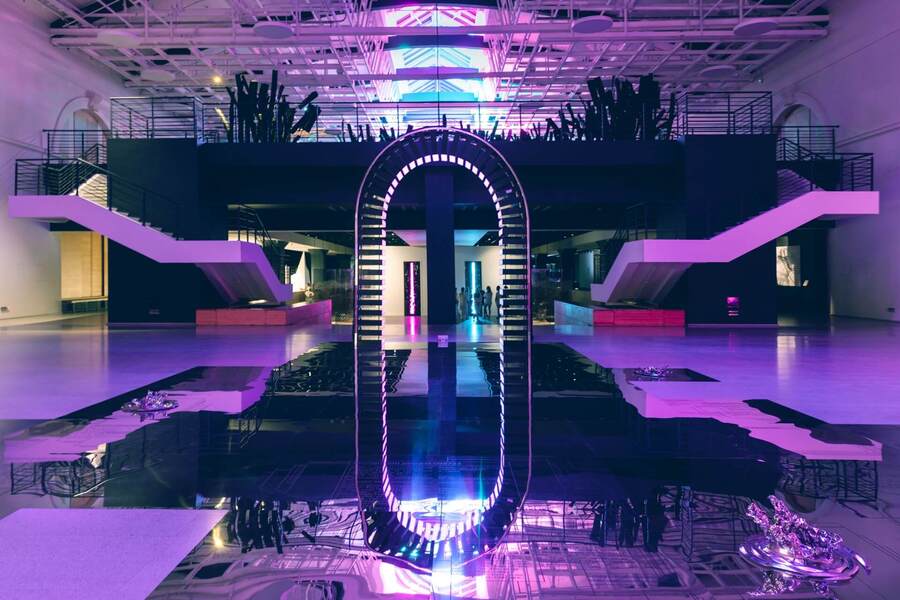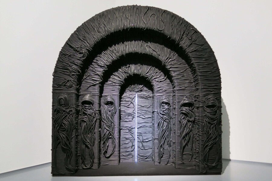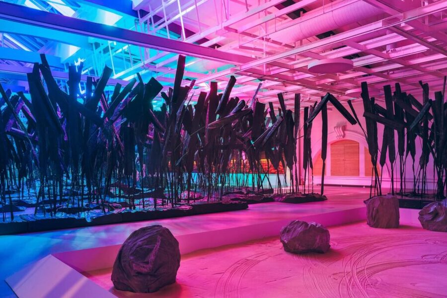 Инсталляции, где переработанный пластик и фрагменты промышленных конструкций собираются в мягкие, почти текучие формы. Несмотря на жёсткость материала, пространство кажется живым.