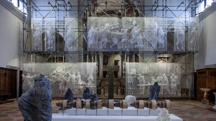 Важный момент: переработанный материал не скрывается. Он оставлен как открытая структура, подчёркивающая хрупкость цифровой веры.