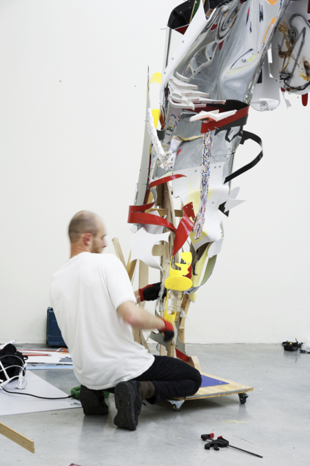 Его объекты — это скульптуры и инсталляции, собранные из фрагментов рекламных баннеров, печатных материалов и остатков печатной индустрии — он берёт визуальный мусор, чтобы показать, как потребление формирует визуальную среду.