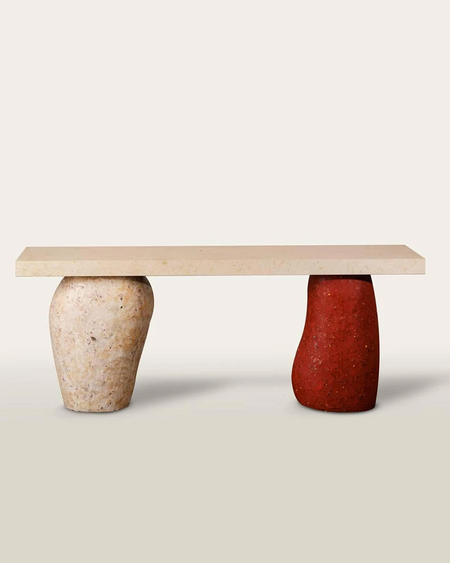 Марина Бусел и Иван Ходырев. Консоль Home Menghir и Скамья Spring Bench. 2025. Покрытие из переработанной древесины и минералов «Ежевика»