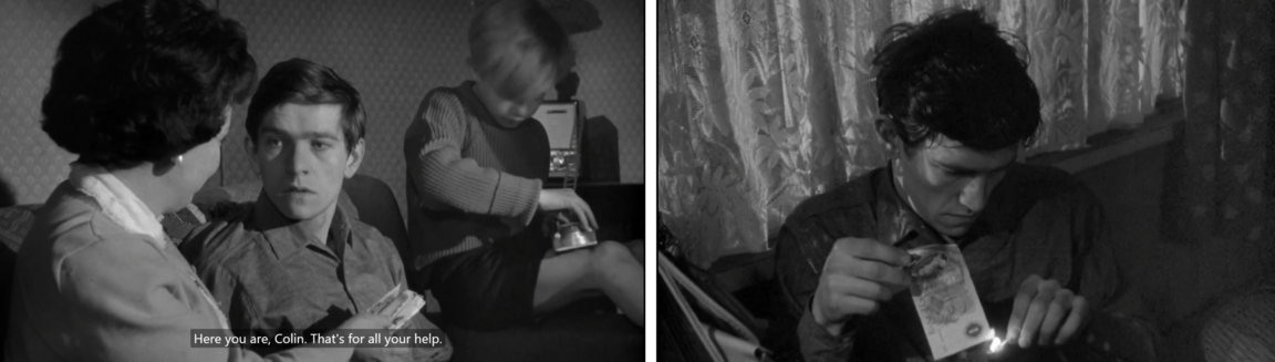 Следующие кадры показывают расточительное отношение матери к деньгам. Сразу же куплен телевизор, новая одежда и вкусная еда, однако обои так и остались с подтеками. Колину же она дает немного денег как благодарность за помощь, он единственный, кто ничего не просил у матери. Неохотно приняв мамину благодарность, он уходит в другую комнату, где еще недавно умирал отец, и сжигает деньги. Для того времени и контекста это можно назвать смелым, шокирующим и бунтарским поступком. Это протест против мнимой роскоши и общества потребления.