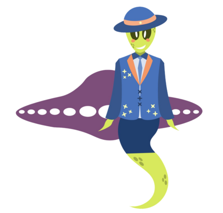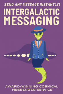 «Яркий постер для цифрового стартапа, фоновый цвет — насыщенный фиолетовый, современный плоский стиль. В центре изображён маскот-инопланетянин в синем костюме и шляпе, позади него — стилизованный фиолетовый НЛО с белыми огнями. (За основу взять мое фото-референс). Наверху крупный рекламный слоган: 'SEND ANY MESSAGE INSTANTLY! '. В центре — большой заголовок в ретро-футуристичном гротесковом шрифте: 'INTERGALACTIC MESSAGING'. Внизу подпись заглавными буквами: 'AWARD-WINNING COSMICAL MESSENGER SERVICE'. Всё оформление — лаконичное, стиль ретро-футуризм, цвет текста— кремовый и оттенки фиолетового на фон плаката.»