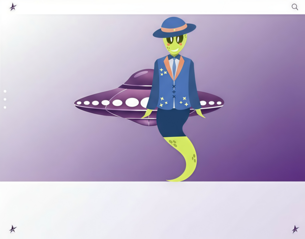 «Цифровой постер для платформы случайных писем: минималистичный и чистый дизайн, нежный фиолетовый градиент на фоне. В центре кадра — дружелюбный маскот-инопланетянин в синем костюме и с фиолетовой летающей тарелкой за спиной (опираться на моё фото). Звёзды по краям сайта. Оформление напоминает современный героя сайта или обложку приложения, ничего лишнего, только персонаж и фон, стиль — модный, лёгкий, digital-friendly»