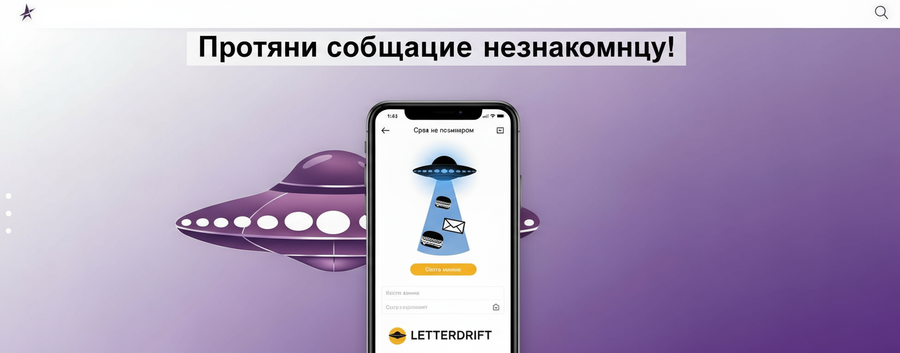 «Современный digital-постер для интернет-проекта на тему случайных сообщений. Светлый градиентный фон в фиолетовых тонах, по центру — крупное изображение мобильного телефона, на экране которого нарисован знак с летающей тарелкой, падающим лучом и письмом. На заднем плане большая фиолетовая летающая тарелка в стиле flat illustration. В верхней части постера — жирный чёрный заголовок в рамке: 'Протяни сообщение незнакомцу! '. Дизайн лаконичный, в духе технологичного бренда, акцент на сочетание фиолетового, белого и жёлтого.»