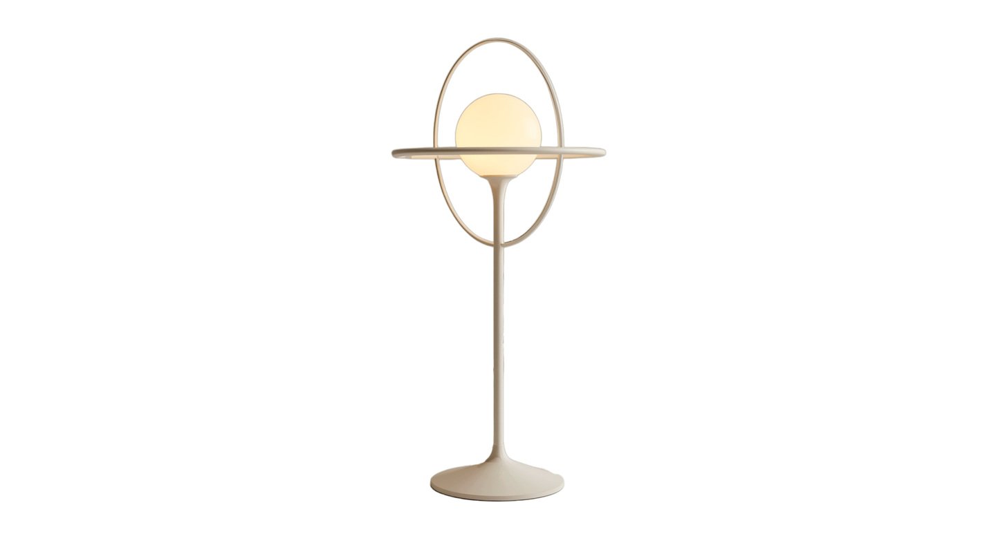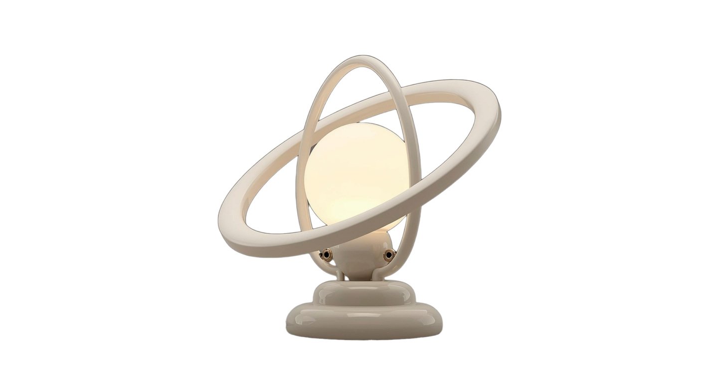 Futuristic space age table lamp inspired by 1960s design, spherical white glossy lampshade resembling a planet, surrounded by metallic chrome rings like Saturn’s rings, smooth geometry, perfect symmetry, minimalistic object design, high-gloss ceramic or lacquered plastic surface, polished aluminum rings, clean neutral studio background, soft diffused lighting, realistic shadows, product photography style, ultra high resolution, design object, collectible lighting piece, modernist sci-fi aesthetic