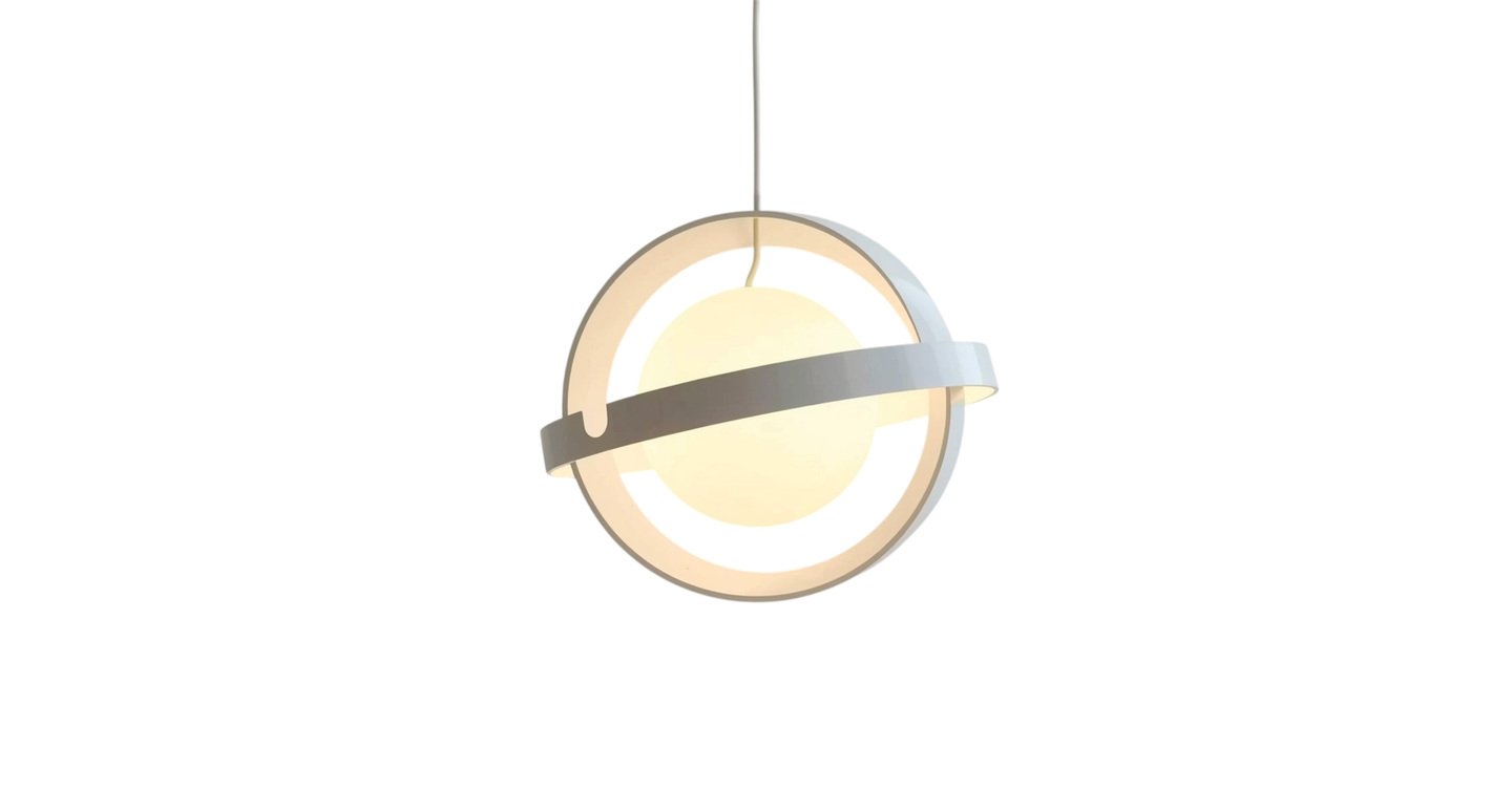 Futuristic hanging lamp inspired by space age aesthetics. A central spherical light element with fragmented or asymmetrically placed circular rings around it. Floating effect, light and balanced geometry. Minimal retro-futuristic object design, clean lines, smooth surfaces. White glossy plastic, soft studio lighting, isolated background. Designed as a 3D printable lighting object.