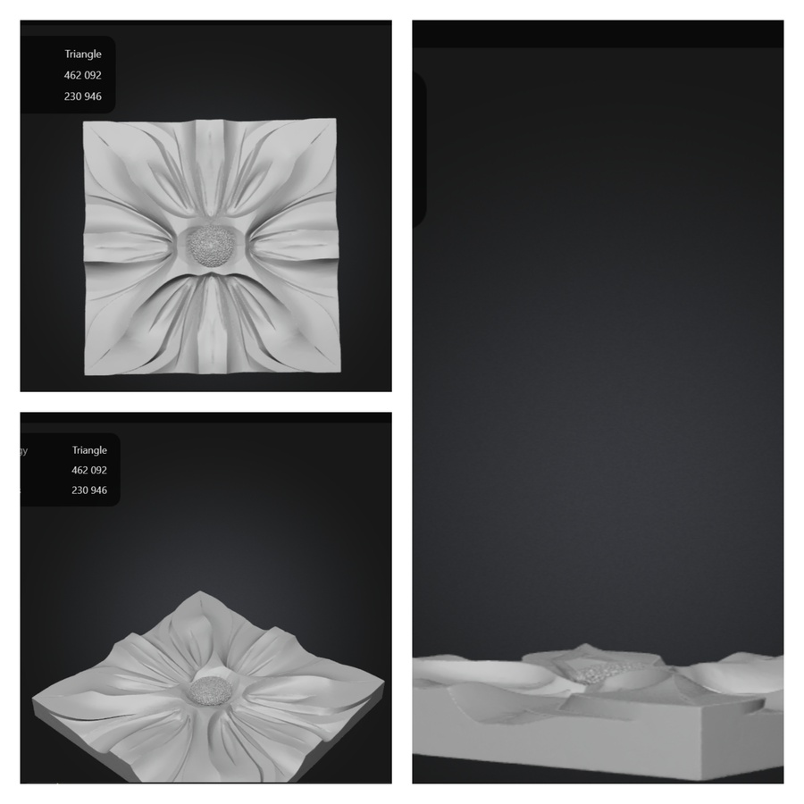 - Формат одного панно: квадрат - Размеры: 300 × 300 мм - Общая толщина изделия: 25–35 мм - Максимальная глубина рельефа: до 25 мм - Размер выбран как оптимальный для настенного размещения и печати без сегментации.