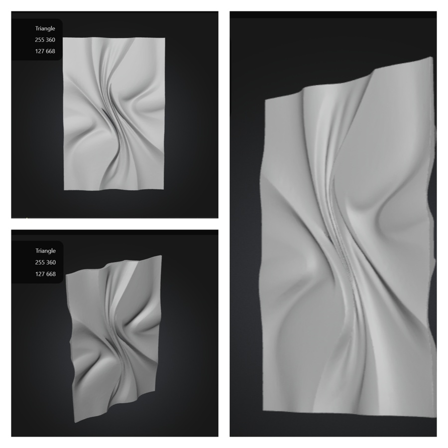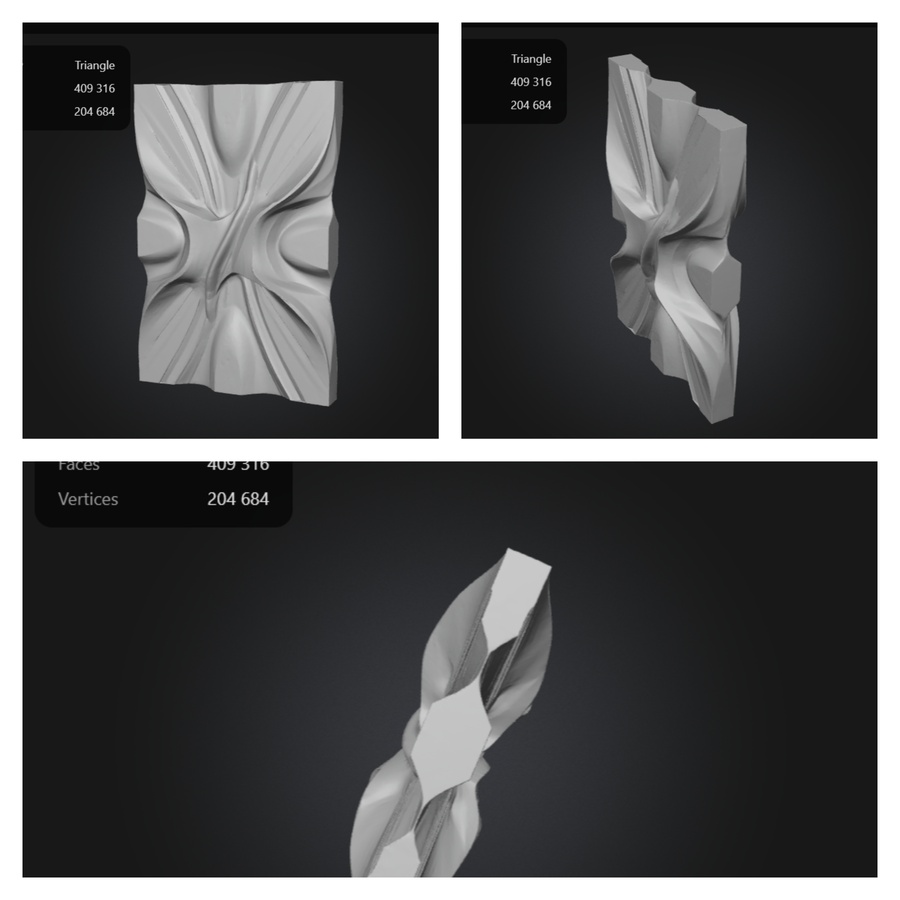 Эскизы объектов были разработаны с использованием платформы Leonardo.ai. На их основе при помощи Meshy AI были созданы полнофункциональные 3D-модели, пригодные для дальнейшей визуализации и производства. Часть панно спроектирована как самостоятельные арт-объекты: благодаря продуманной геометрии и устойчивым пропорциям они могут использоваться не только в настенном формате, но и как интерьерные настольные скульптуры, выступая акцентными декоративными элементами пространства.