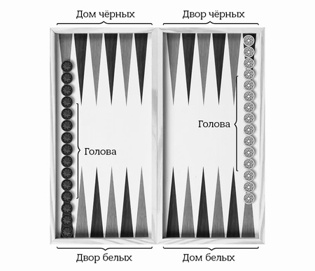 Начальная позиция: все 15 шашек одного цвета располагаются в одном пункте — «голове»