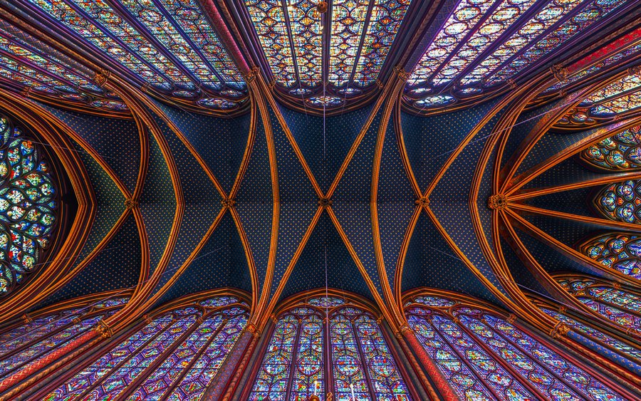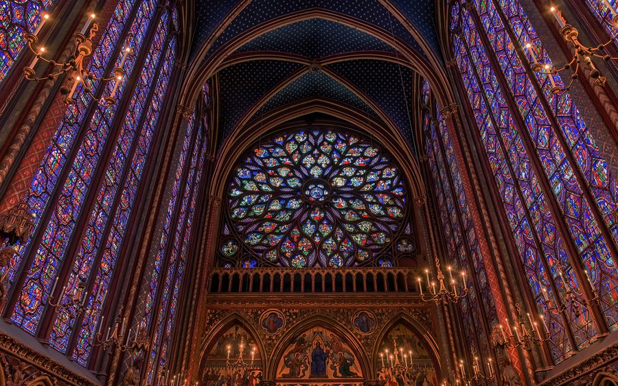 Готика открыла новую главу этого разговора. В «Сент-Шапель» (1243–1248, Париж, архитектор Пьер де Монтрей) мы замечаем концепцию «стеклянной стены». Витражи готической капеллы занимают 75% площади верхней часовни, из-за чего стены почти полностью состоят из стекла. Это было архитектурное новшество стиля Районнант, подчеркивающее свет и цвет для создания небесной атмосферы. Человек входит внутрь сияния и становится его частью.