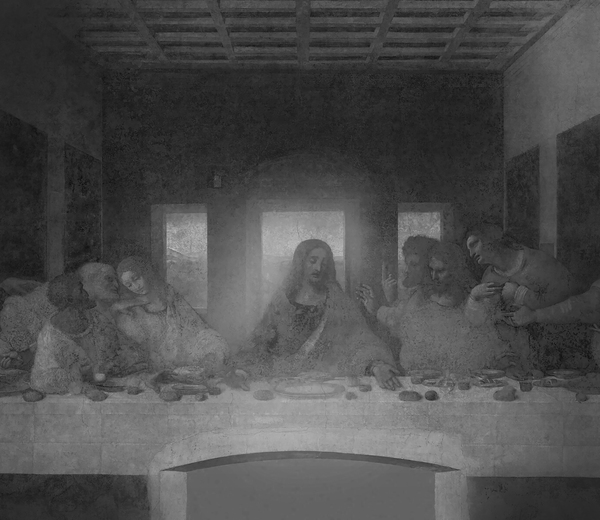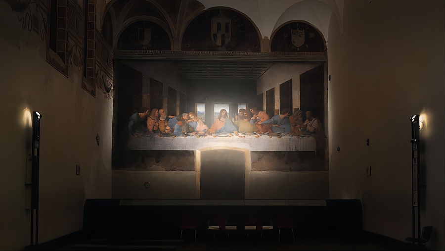 В монастыре Санта-Мария-делле-Грацие свет на «Тайную вечерю» попадает не случайно: его направление определено самим архитектурным устройством трапезной. Окна расположены сбоку от фрески, и дневной свет скользит вдоль стены, почти не падая прямо на поверхность. Из-за этого освещение получается мягким и рассеянным — без резких бликов, что помогает воспринимать композицию так, как её задумывал Леонардо.