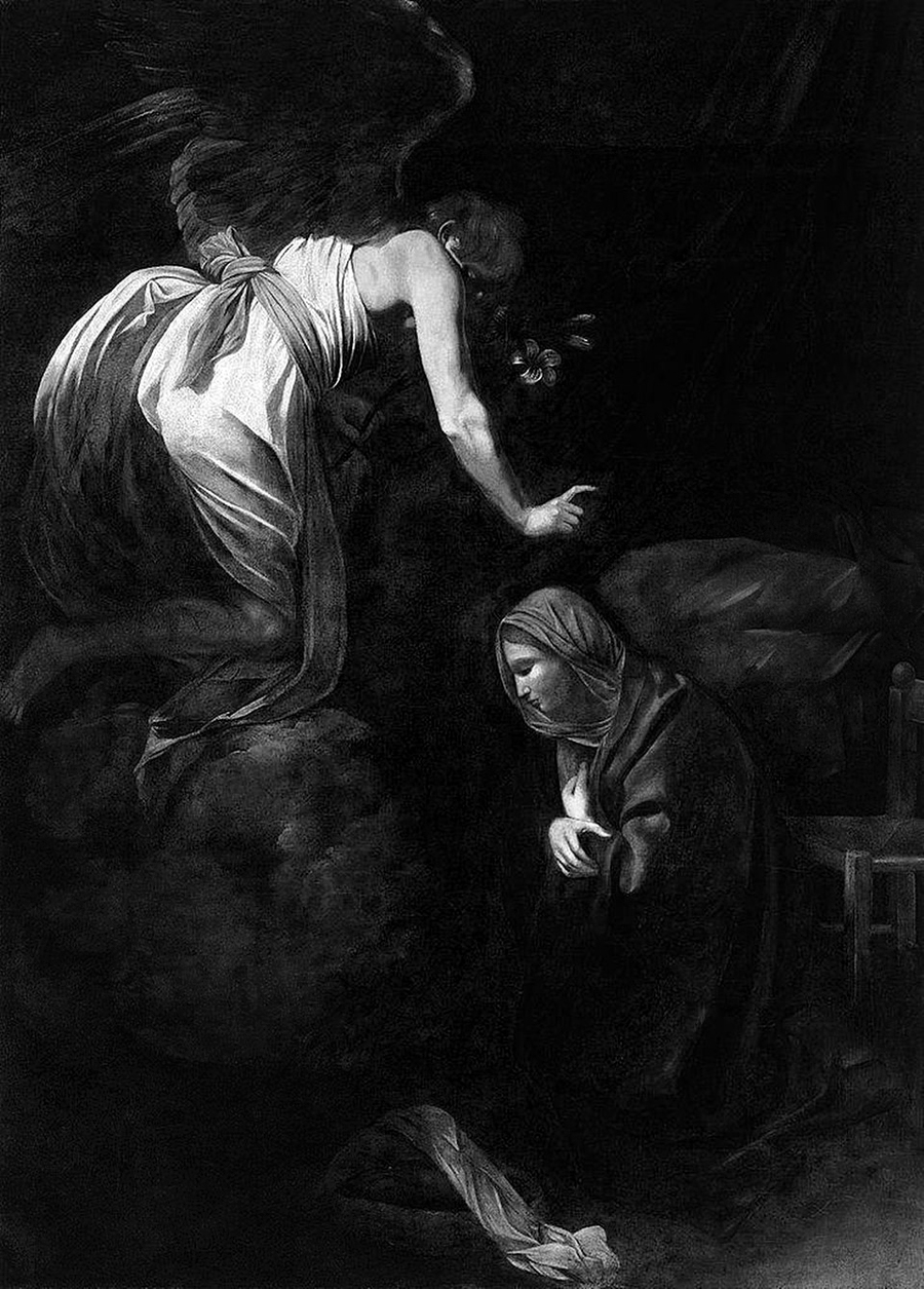К XVII веку свет становится не просто символом, а драматургическим инструментом, языком откровения и боли. В «Благовещении» (1608, Микеланджело Меризи да Караваджо) тьма распадается на части, и из её недр вырывается острый луч — не просто источник света, а акт вмешательства Бога в материальный мир.