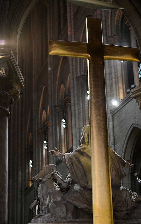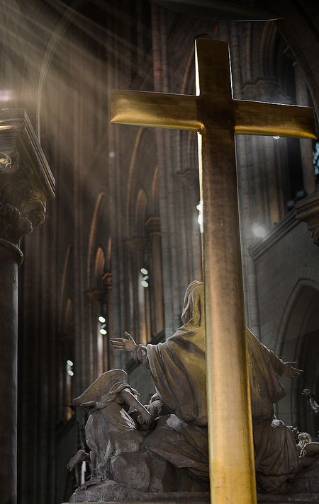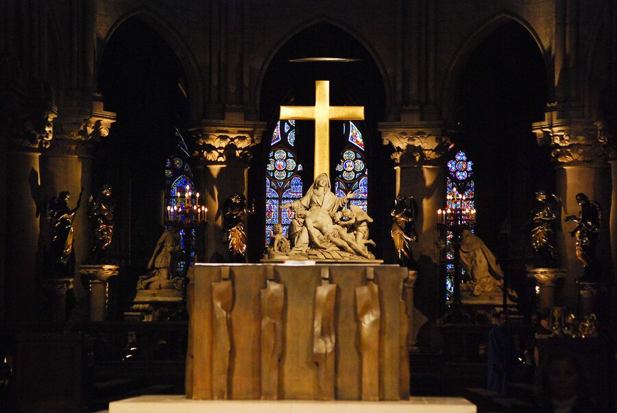 На фотографиях показана алтарная зона Собора Парижской Богоматери и расположенная перед алтарём скульптура «Пьета» с фигурой Девы Марии и распятого Христа (Нотр-Дам, XIX век, скульптор Николас Кусту). Внутри собора свет устроен таким образом, что основные лучи поступают через витражи, находящиеся за алтарём. Из-за этого скульптурная группа оказывается выделена мягким светом, тогда как окружающее пространство остаётся заметно темнее.