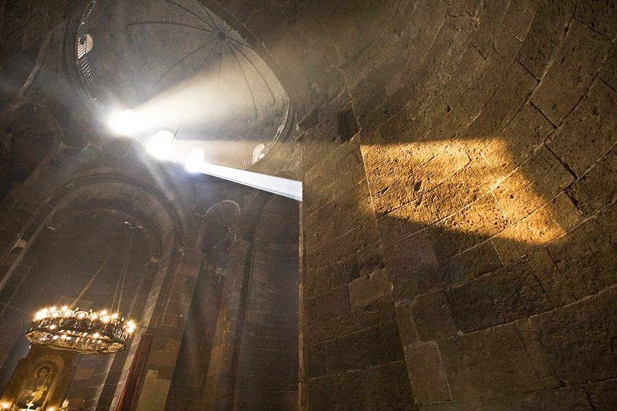 Мне хотелось начать с ранней архитектуры, где свет ощущается физически — как вход в священное пространство. Одним из важных примеров стал монастырь Джвари (VI век, Грузия). Внутри этого храма свет попадает очень дозировано: он больше напоминает дыхание, чем поток. Мне кажется, что именно здесь складывается раннее понимание света как знака присутствия — его слишком мало, чтобы он был просто освещением, но этого «мало» достаточно, чтобы создать ощущение связи с чем-то большим. Не случайно купол Джвари воспринимается не как конструкция, а как «глаз неба», через который Бог смотрит на землю.